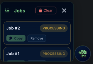 Click the Jobs button in the modal toolbar to open the Jobs Drawer. This shows all your active and completed jobs.