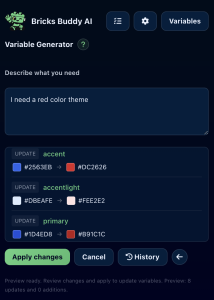 The Variable Generator uses AI to suggest and make updates to your CSS variables based on how you prompt it